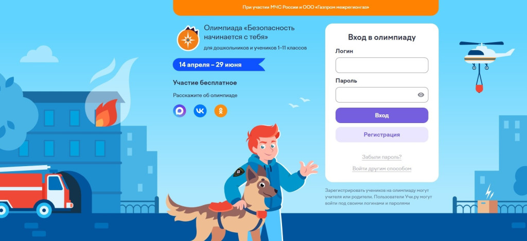 Для участия в Олимпиаде необходимо зарегистрироваться на платформе Учи.ру или войти с логином и паролем.