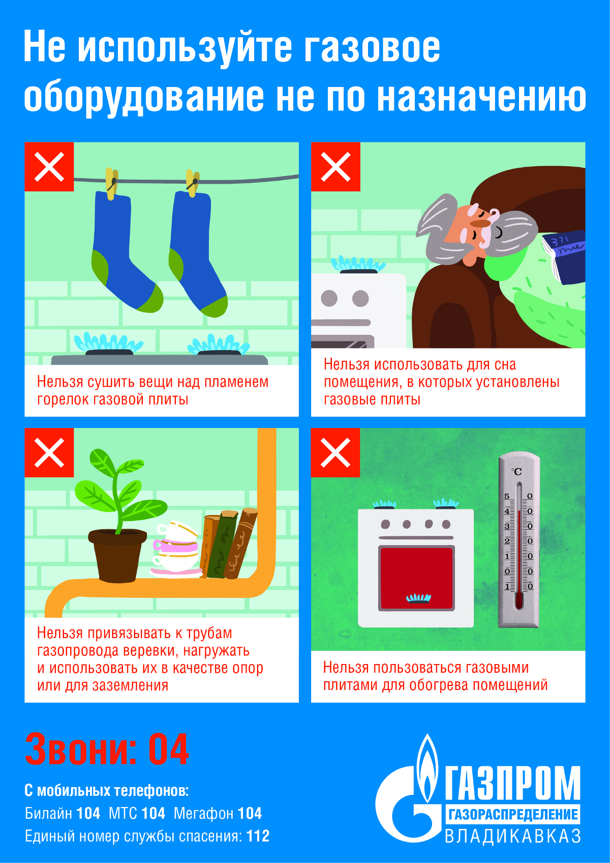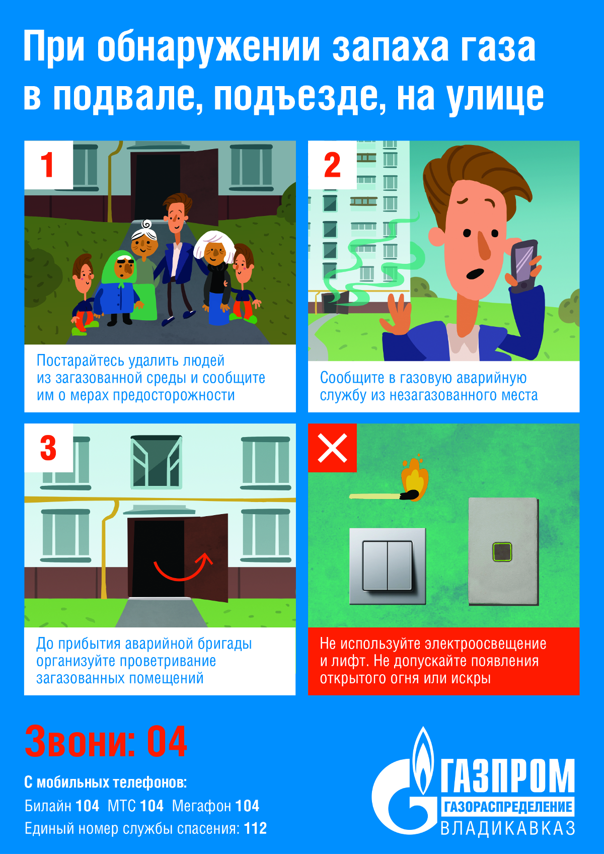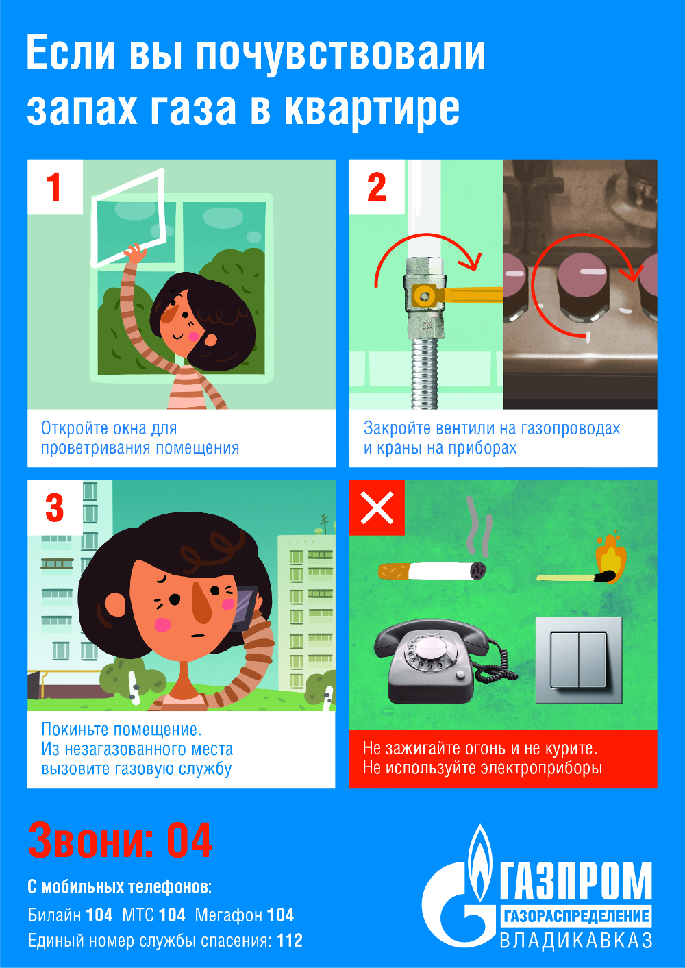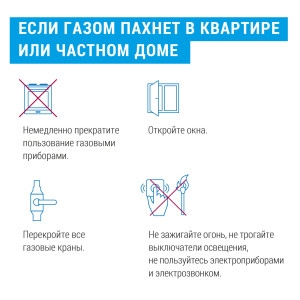 – при появлении запаха газа закройте все газовые краны, проветрите помещения, не зажигайте огня, не включайте и не выключайте электроприборы, вызовите аварийную бригаду по телефону: 04 (с моб. 104);