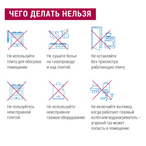 – не оставляйте зажжённые горелки без присмотра. При внезапном потухании пламени немедленно закройте все газовые краны, тщательно проветрите кухню.